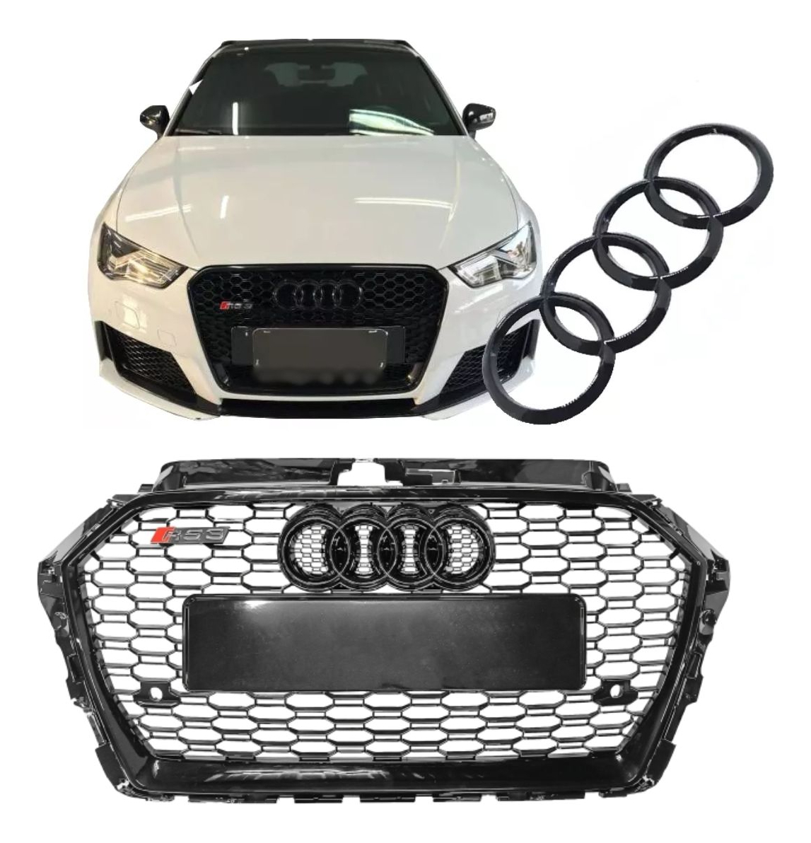 Conteúdo da Embalagem: 1 Grade RS3 Black, 1 Suporte de Placa,1 Emblema Audi
